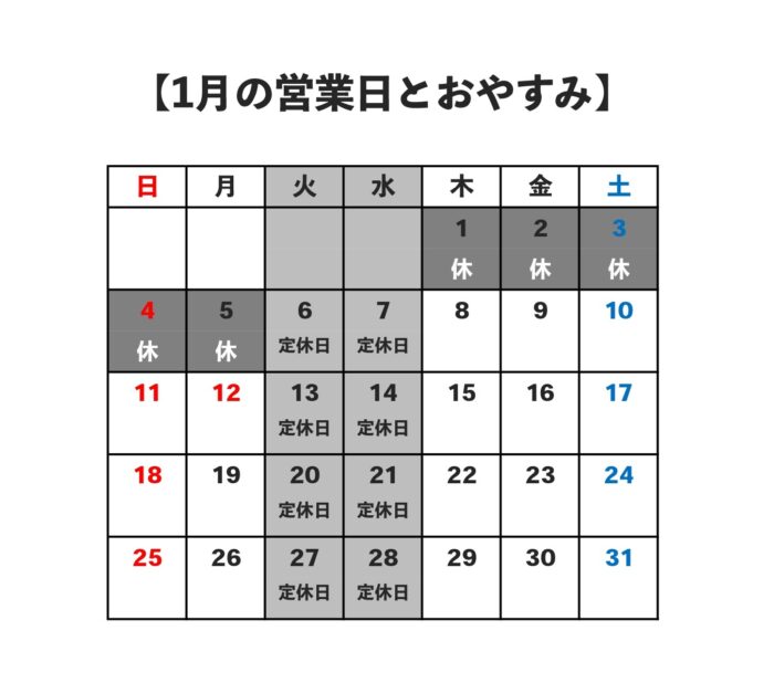1月も、火曜日と水曜日が定休日となります。
